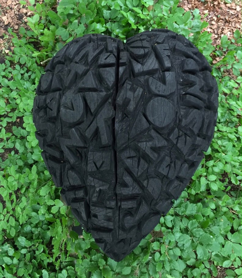 Som det ligger der, spejler det omgivelserne. Vi får omverdenen tilbage, når vi ser ind i det spejlblanke store hjerte. Om det er træer og himmel i skoven, bygninger og biler, eller vægge, vinduer og lamper – og ja, går vi tæt nok på, bliver vi selv en del af spejlbilledet.
