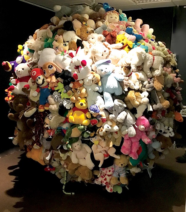 I udstillingen er de sat sammen til, ikke en stor hjerteform, men derimod en stor kugle eller klode – en tøjdyrsklode fuld af hjertevarme.